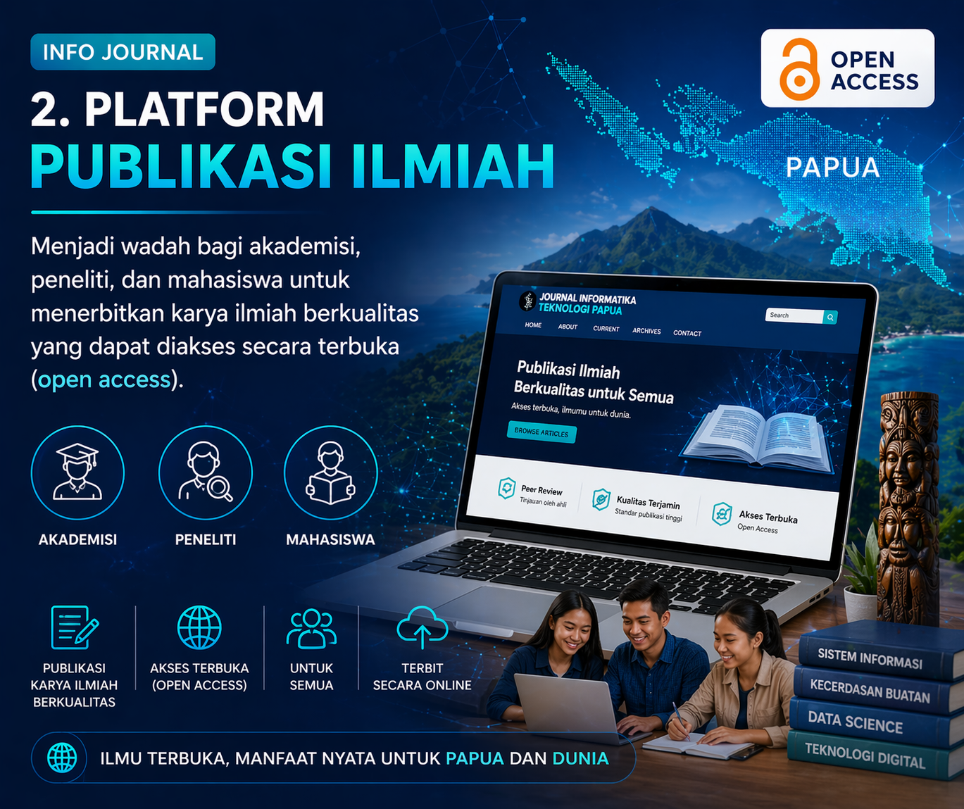 Jurnal ini mengusung konsep open access, sehingga seluruh publikasi dapat diakses secara bebas oleh masyarakat luas. Hal ini diharapkan dapat mempercepat penyebaran ilmu pengetahuan serta meningkatkan kontribusi riset terhadap pengembangan teknologi di Indonesia, terutama di Papua.